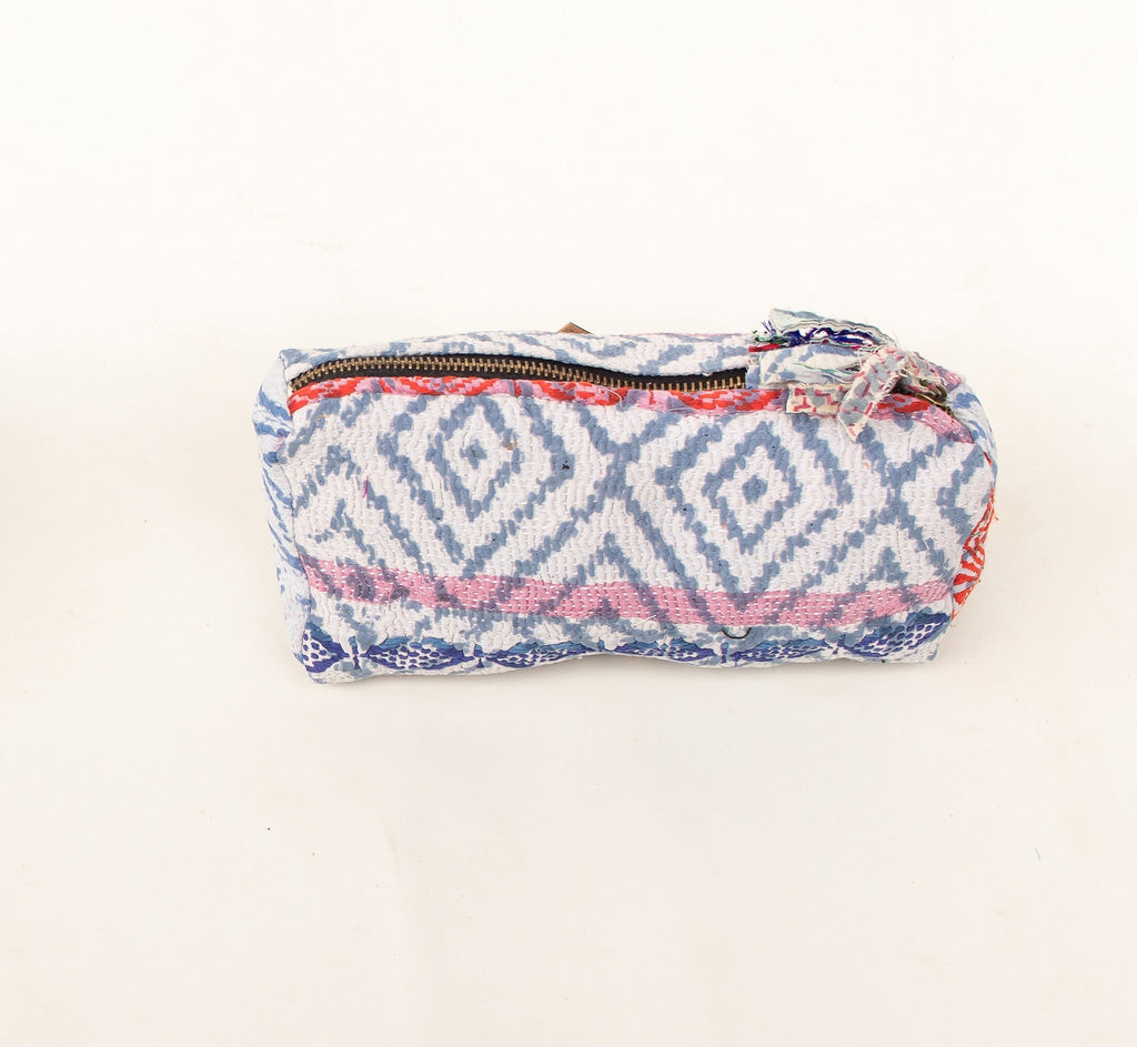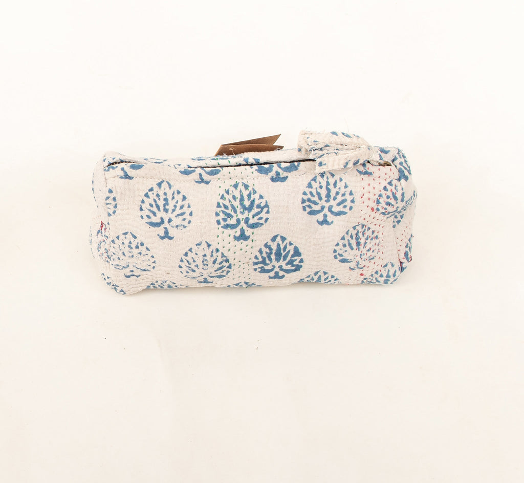 Detaljer: Materiale: 100% vintage sari tekstil (hvide/creme med block print), Størrelse: 17 × 25 cm, Lukning: robust lynlås, Oprindelse: håndlavet i Indien