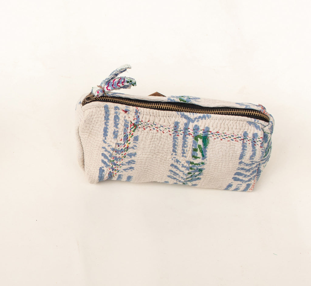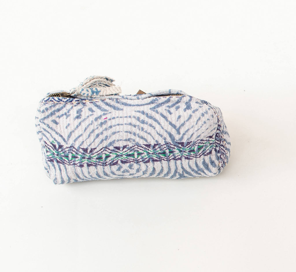 Detaljer: Materiale: 100% vintage sari tekstil (hvide/creme med block print), Størrelse: 17 × 25 cm, Lukning: robust lynlås, Oprindelse: håndlavet i Indien