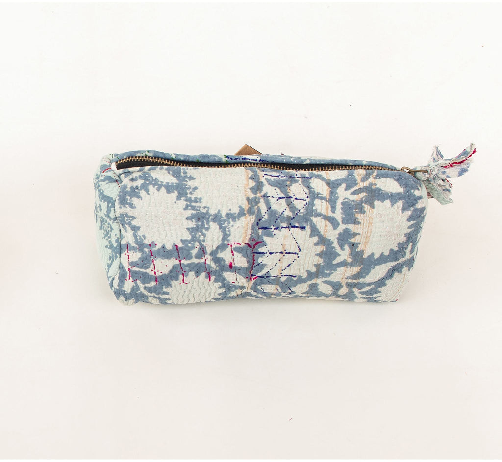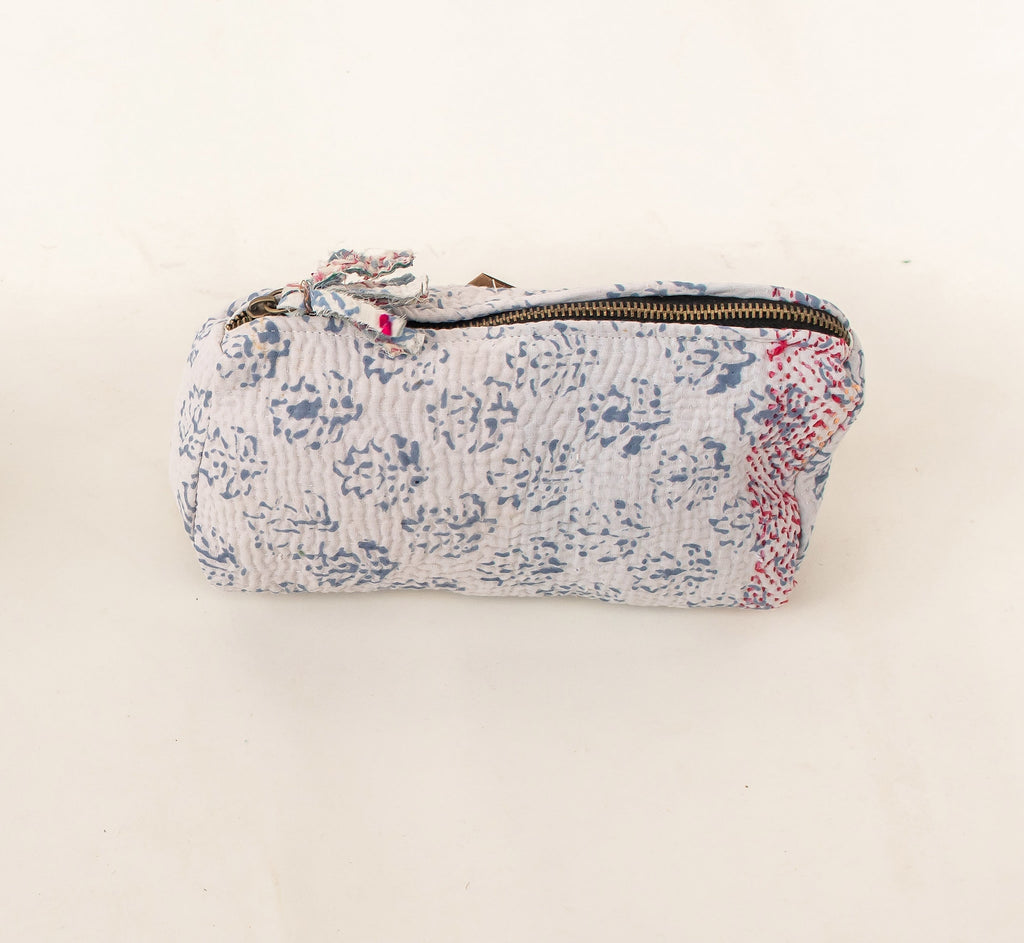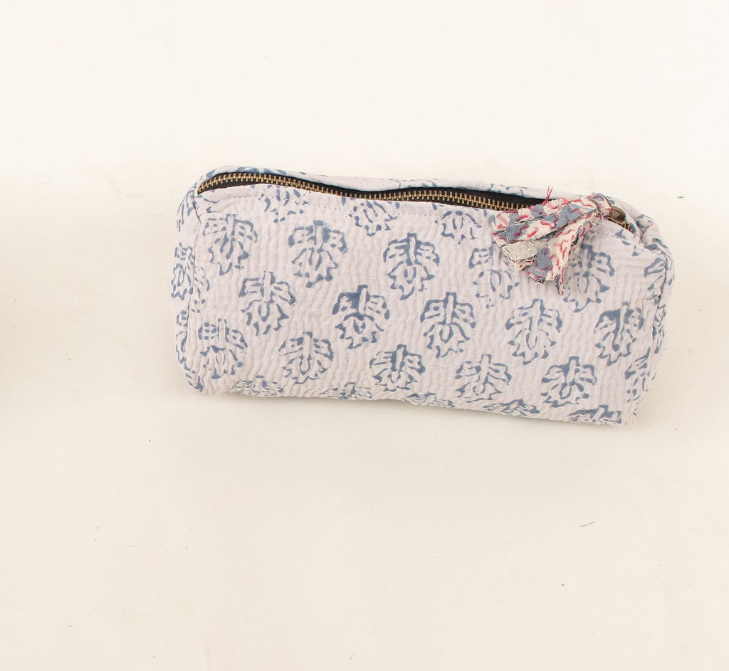 Detaljer: Materiale: 100% vintage sari tekstil (hvide/creme med block print), Størrelse: 17 × 25 cm, Lukning: robust lynlås, Oprindelse: håndlavet i Indien