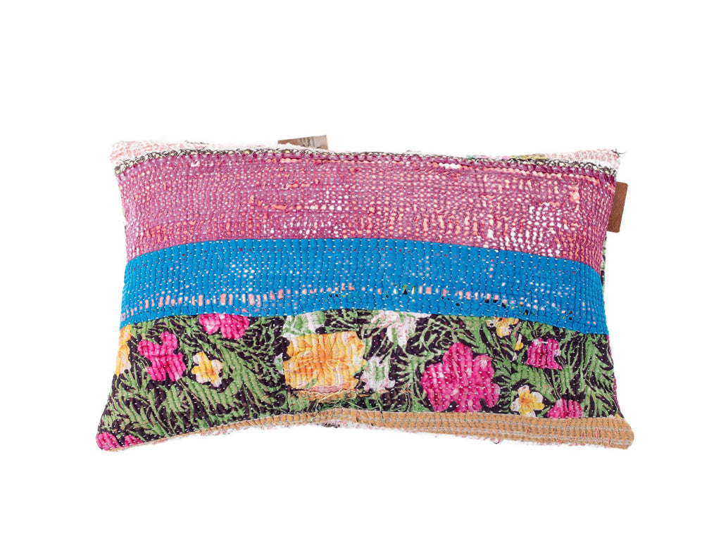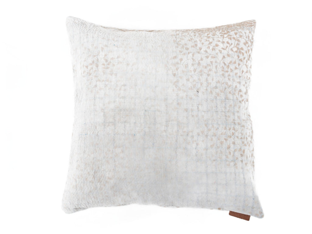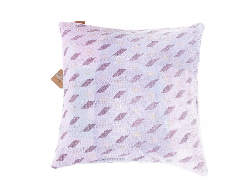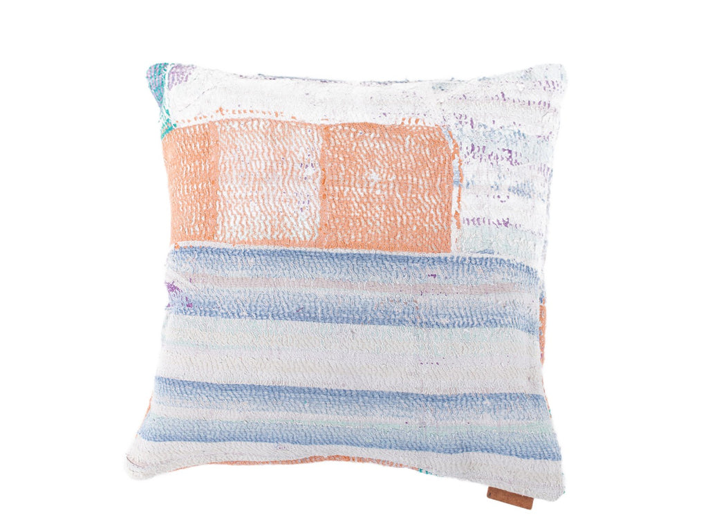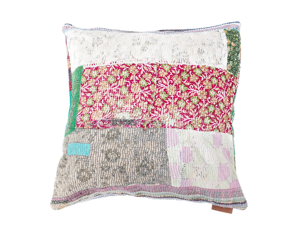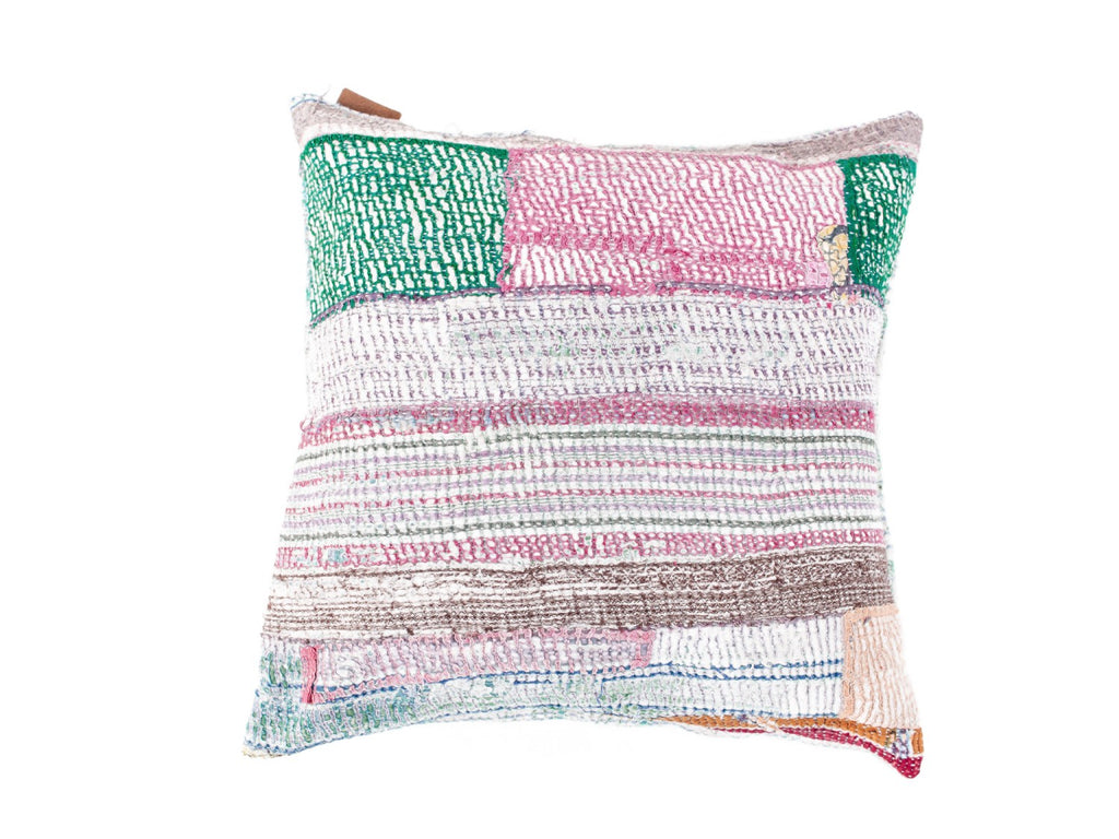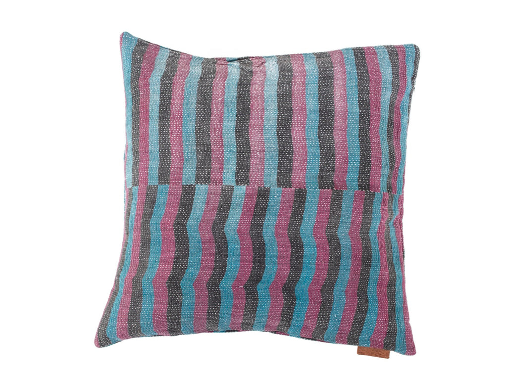 Fine Q er Sari-puder, der er produceret af en type sari, der har et andet udtryk end vores normale Sari Kantha-puder. De er lavet af tyk genbrugsbomuldssari lagt sammen med flere lag imellem og med et slidt look, hvor sarierne der er indeni er med til at give hele puden et meget råt vintage look. De er tonet ned i farver og mønstre og er syet med mindre og tættere Kantha-sømme, som giver dem et autentisk look..